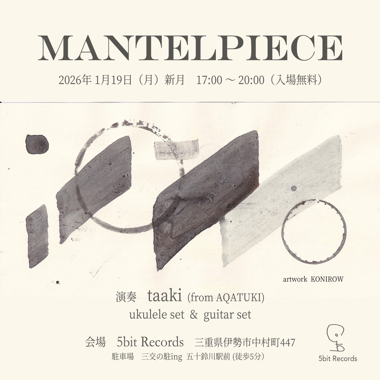 26.1.19.Mon. MANTELPIECE #03@5bit Records 2026年1月9日2025年11月11日 投稿者: AQATIKI_info 2026.1.19(Mon.) area:三重県伊勢市 venue:5bit Records act:taaki